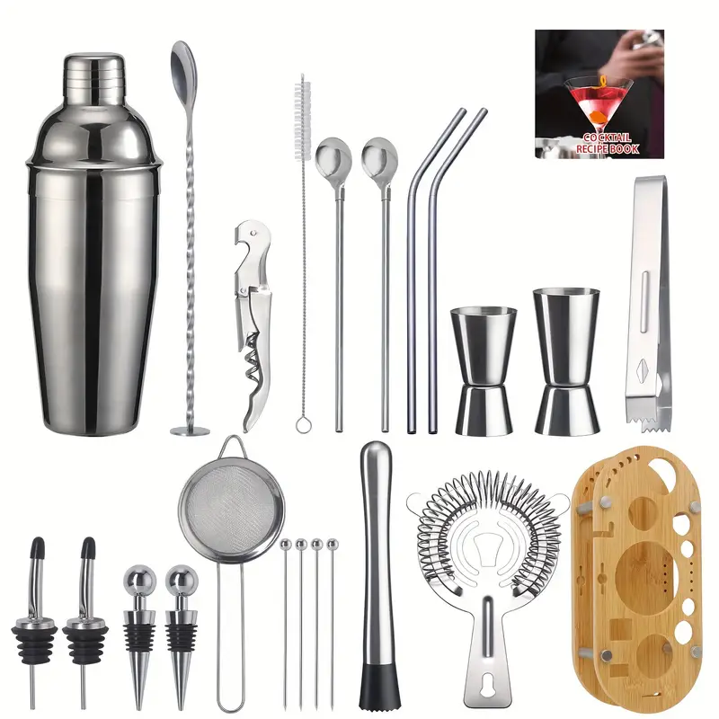 Практичний і стильний набір барного приладдя стане незамінним помічником для тих, хто любить готувати коктейлі вдома. Завдяки йому процес приготування напоїв на кшталт негроні, маргарити чи пінa колади перетворюється на легке та захопливе заняття. Усі інструменти виготовлені з якісних матеріалів, що гарантує довговічність і зручність у використанні. Дерев’яна підставка не лише забезпечує акуратне зберігання, а й стає елегантним елементом інтер’єру домашнього бару.